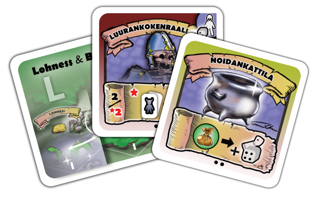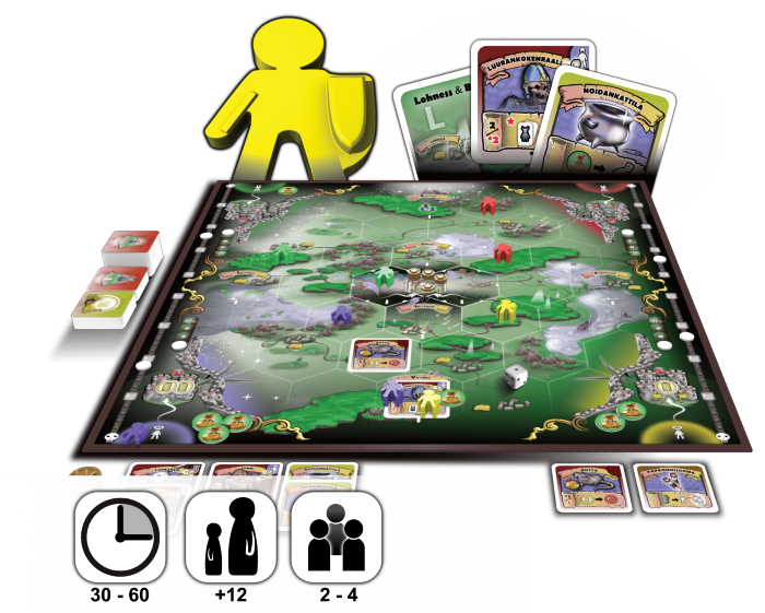 Laatikko sisältää pelilaudan, nopan, pelimerkit, Suomessa valmistetut pelinappulat, yli 90 korttia sekä suomenkielisen ohjekirjan.