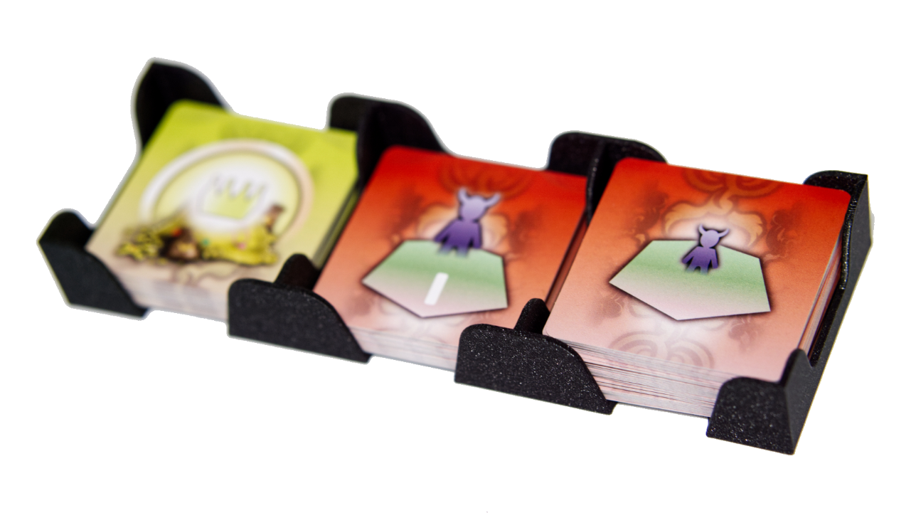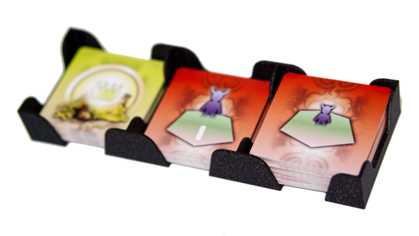 3D-tulostettu korttiteline, jossa korttipinot pysyvät suorassa ja järjestyksessä niin pöydällä kuin pelilaatikossakin. Lisäksi telineestä kortteja on helppo ja nopea käyttää.