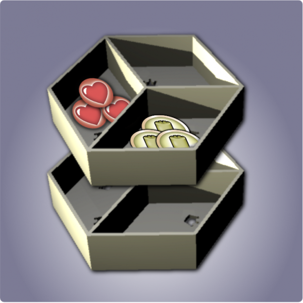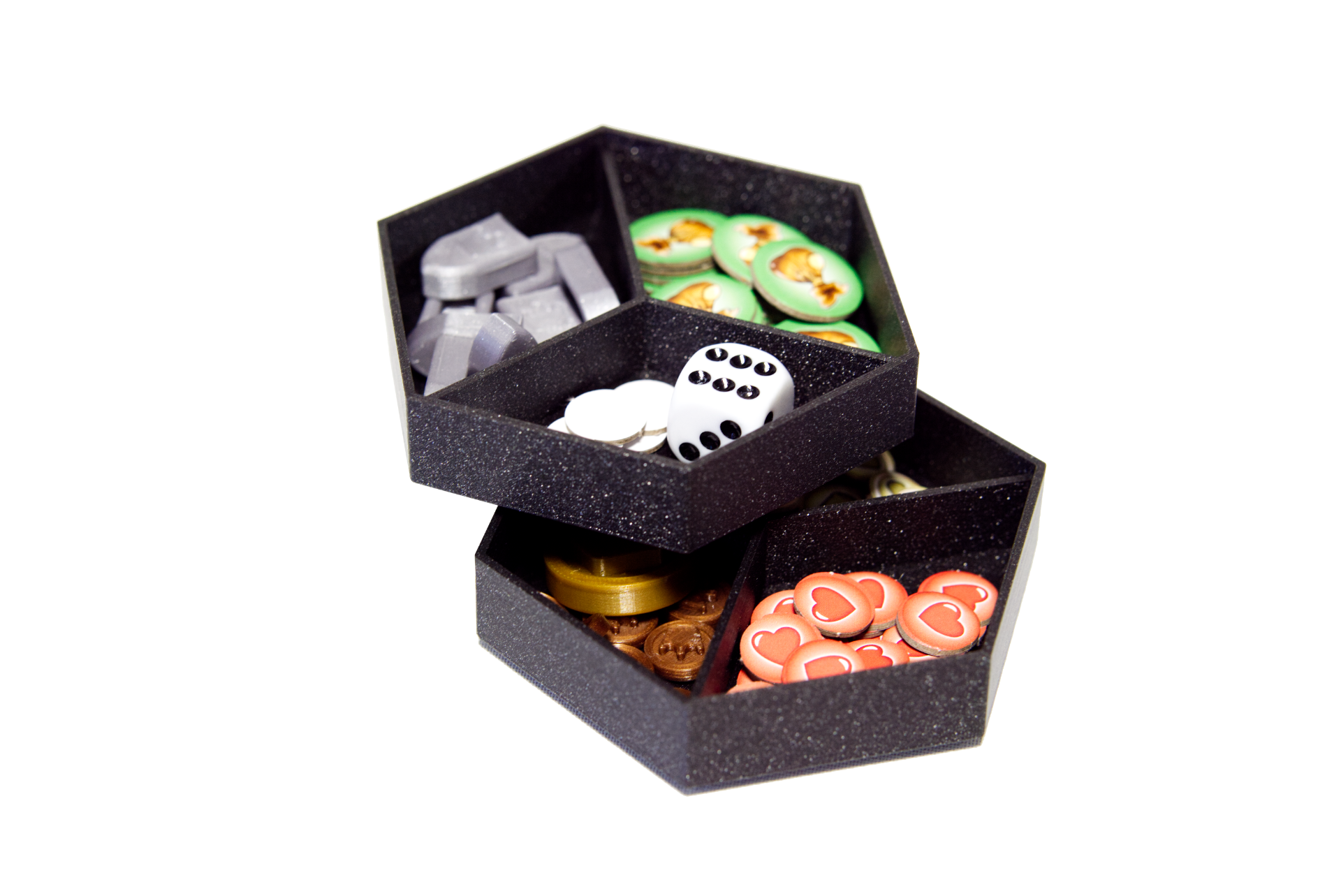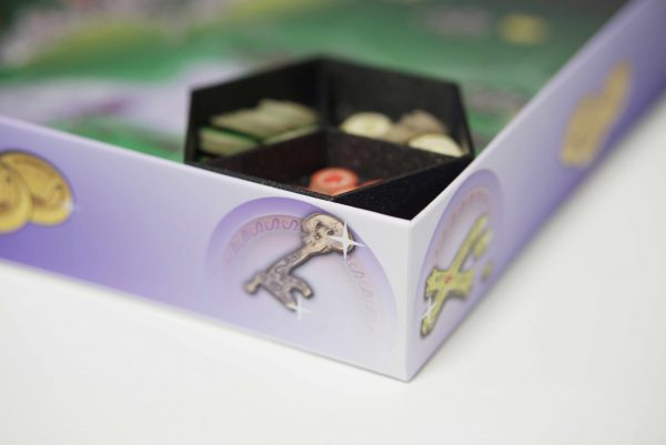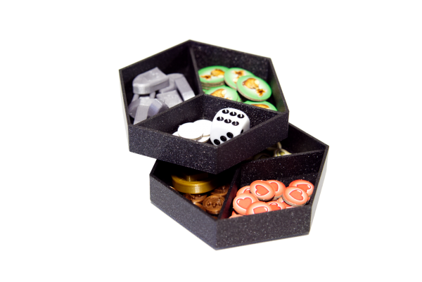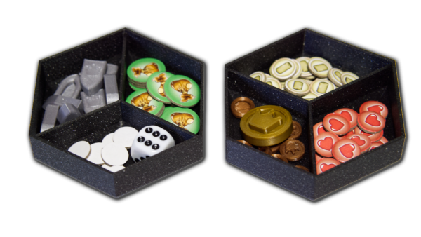 2 kappaletta pinoutuvia 3D-tulostettuja säilytysrasioita, joihin mahtuvat kaikki pelimerkit ja nappulat ritareita lukuunottamatta. Rasioista pelimerkkejä on helppo käyttää sekä ne pysyvät järjestyksessä pelin tiimellyksessä.